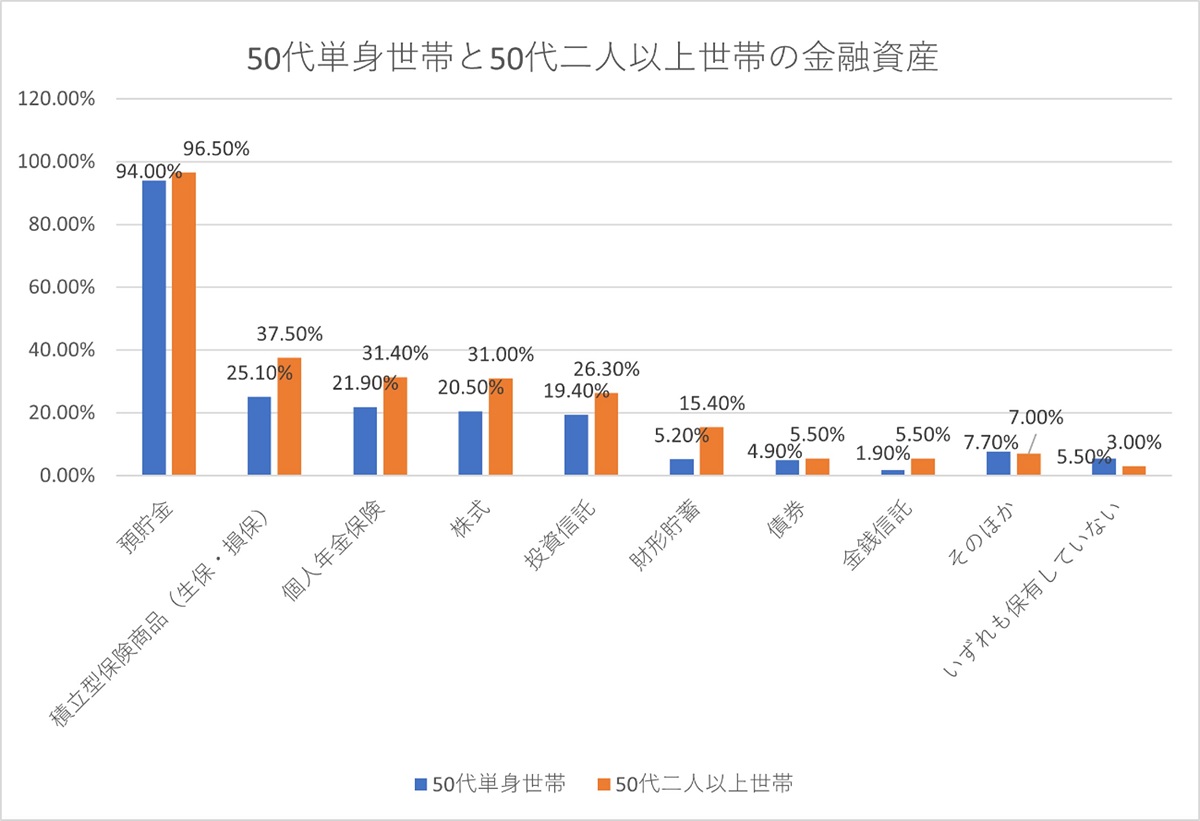 独身の方と比較して、2人以上世帯では金融資産の保有率が全体的に上がっています。
