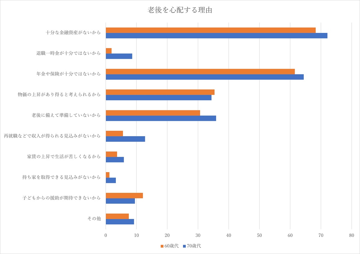 また、60歳代および70歳代の、老後を心配する理由は下図のとおりです。
